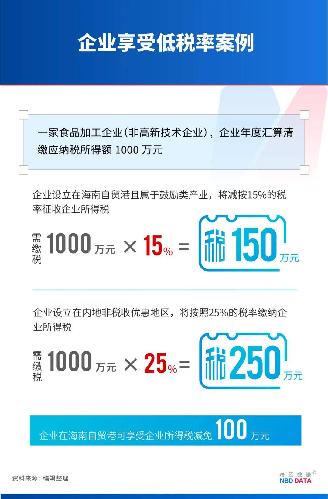 低税率,也被简称为“两个15%”政策,指的是对合适前提的企业,减按15%征收企业所得税;对合适前提的小我,其小我所得税现实税负跨越15%的部门,予免得征。以一家食物加工企业(非高新手艺企业)为例,企业年度汇算清缴应纳税所得额1000万元。若是企业设立正在内地非税收优惠地域,按照25%的税率缴纳企业所得税,需缴税250万元。若是企业设立正在海南自贸港且属于激励类财产目次企业,将减按15%的税率征收企业所得税,仅需缴纳150万元。